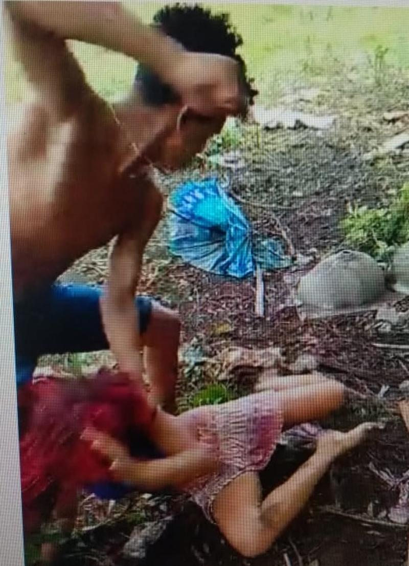 A jovem é arrastada pelo cabelo, jogada no chão e agredida muitas vezes com socos. Não satisfeito, o agressor se apossa de um pedaço de pau e ataca a jovem que está caída ao chão enquanto o outro criminoso que filma diz, “na cabeça não”.