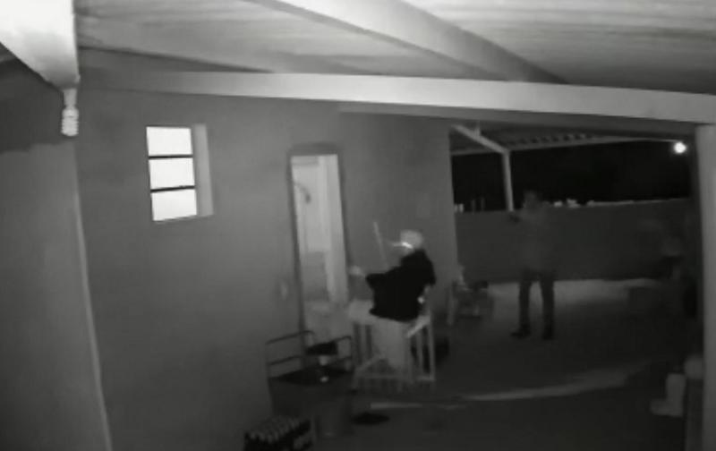 Câmeras do circuito interno da residência flagraram a ação dos criminosos. Um dos bandidos abriu a porta da frente por meio de chutes, e rapidamente adentrou a casa em posse de uma arma. Os outros 3 comparsas entraram em seguida, todos armados. No interior da residência, agrediram e ameaçaram o casal.