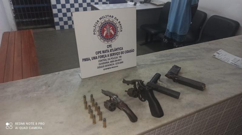 Ao avistar a guarnição dois deles tentaram fugir, em direção a uma residência, a polícia foi atrás e no interior do imóvel foram encontradas duas armas de fogo sobre uma cama, bem como uma motocicleta, sem placa e com restrição de furto/roubo.