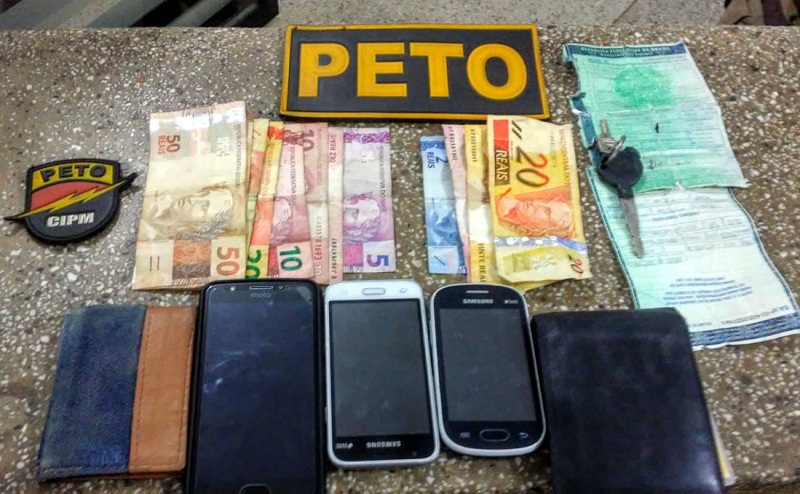 A guarnição, então, entrou em perseguição, vindo interceptar os suspeitos na rua Da Pituba. Quando abordados, foram encontrados os aparelhos celulares das vítimas tomados no assalto.