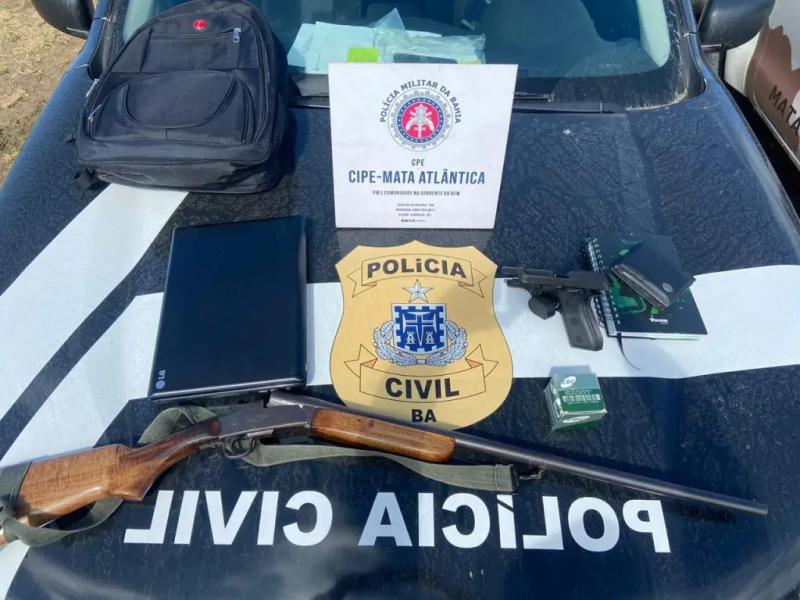 Na sede da fazenda Planície, que é objeto de investigação da Justiça, os policiais encontraram uma espingarda .20 e uma pistola .380, além de cheques, notas promissórias e cadernos de anotações com conteúdo desconhecido pela reportagem.