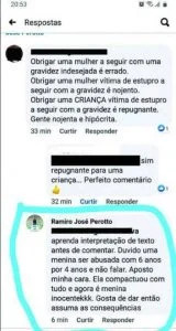 Apesar de o religioso ter excluído a conta na rede social, prints com o post continuam circulando na web. Os comentários foram feitos em uma conversa sobre o caso da criança que interrompeu a gravidez fruto dos abusos. Para Perotto, ela deve “assumir as consequências” por ter “gostado” das agressões.