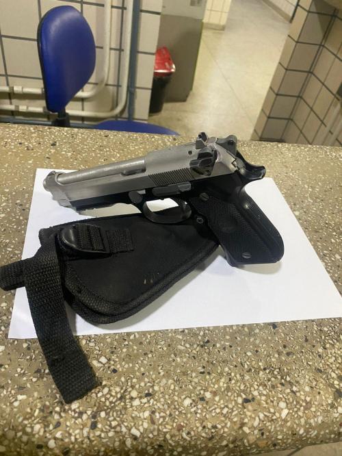 Durante a abordagem, os agentes identificaram que o homem carregava uma arma presa à cintura. Após a imobilização e verificação do objeto, constatou-se que se tratava de um simulacro: uma arma de chumbinho calibre 4.5, conhecida por sua grande semelhança com uma pistola real.