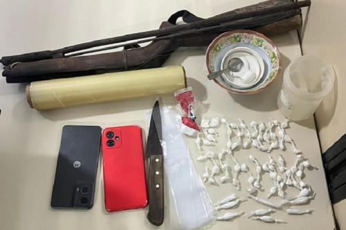 Em seguida, os irmãos informaram que seus documentos pessoais estavam na “Peixaria Dois Irmãos”, estabelecimento de propriedade da dupla. Com a permissão dos suspeitos, os policiais adentraram o comércio e, nos fundos da peixaria, localizaram 75 porções de cocaína, uma pedra de crack, uma espingarda tipo socadeira, um pacote de embalagem, uma faca, dois aparelhos celulares, duas vasilhas plásticas, uma colher e um rolo de papel filme.