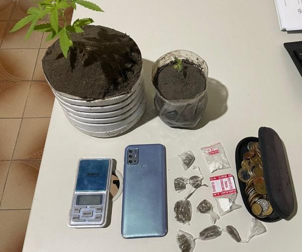 O suspeito estava próximo a uma esquina e ao perceber a presença da força policial, tentou empreender fuga, mas, foi alcançado. Após ser abordado, foi encontrado entre as suas vestes 01 bucha de de maconha. Perguntado se havia mais drogas, o suspeito sinalizou que sim, e na sequência, foi apreendido 02 (dois) pés de maconha (In Natura), 02 (dois) papelotes de cocaína, 08 (oito) buchas de maconha, 01 Balança de precisão (digital); 01 celular, e a quantia de R$ 38,25 (trinta e oito reais, e vinte e cinco centavos) em moedas.