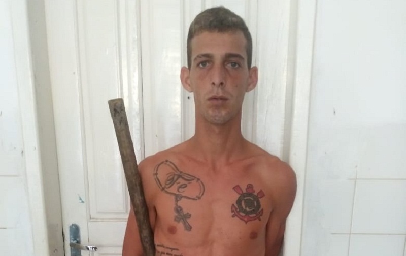 O acusado foi identificado como, Dênis Ramos Sousa, vulgo Dentinho, 22 anos. Quando os PMs chegaram no local, flagraram o jovem, no interior do imóvel, com um pedaço de madeira nas mãos, bastante alterado e dizendo que estava com “cão no corpo”.