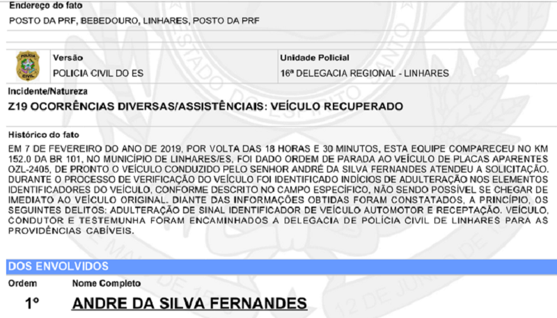 Diante dos fortes indícios de “Adulteração de Sinal Identificador de Veículo Automotor”, os PRFs, conduziram André e o veículo para a Delegacia Territorial de Linhares, onde foi apresentado à delegada, Ivina Queiroz de Oliveira, que após realizar as oitivas, lavrou um Termo Circunstanciado (TCO), por receptação, devendo o advogado responder em liberdade pelo ato, na justiça capixaba. O veículo foi apreendido e encaminhado para perícia técnica para que seja devidamente identificado.