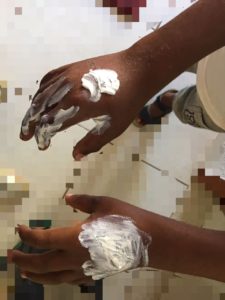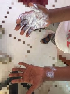 Uma denúncia anônima foi feita ao conselho tutelar, que ao chegar no local se deparou com diversas queimaduras nas mãos do menino, e o encaminhou imediatamente ao hospital para cuidados médicos, devido ao inchaço e possível infecção nas lesões.