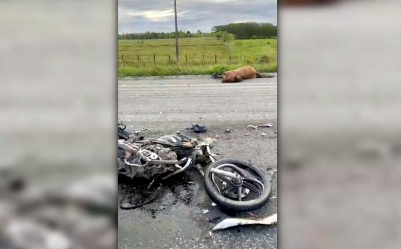 De acordo com a polícia, a moto colidiu com o animal, o que levou os dois ocupantes a caírem na pista. Um veículo de grande porte que seguia pela rodovia passou por cima de uma das vítimas, arrastando-a por alguns metros.