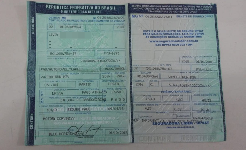 Os policiais consultaram no Sistema Integrado de Cadastro Veicular, através da numeração do chassi e motor, e constataram que o veículo teria a sua placa policial de registro original, PPP 4879, licenciado na cidade de Serra (ES), onde tem um registro de roubo/furto.