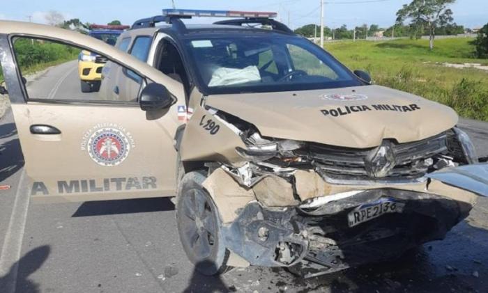 O carro atravessou a estrada e atingiu de frente uma viatura da Polícia Militar.