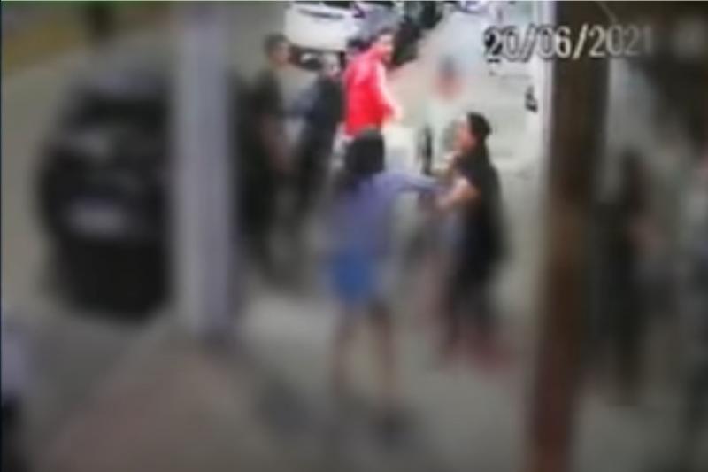 A confusão ocorreu às 2 horas da manhã deste domingo, 20 de junho. No momento em que os homens se aproximam um deles joga uma caneca em direção a mulher, que é atingida na cabeça.