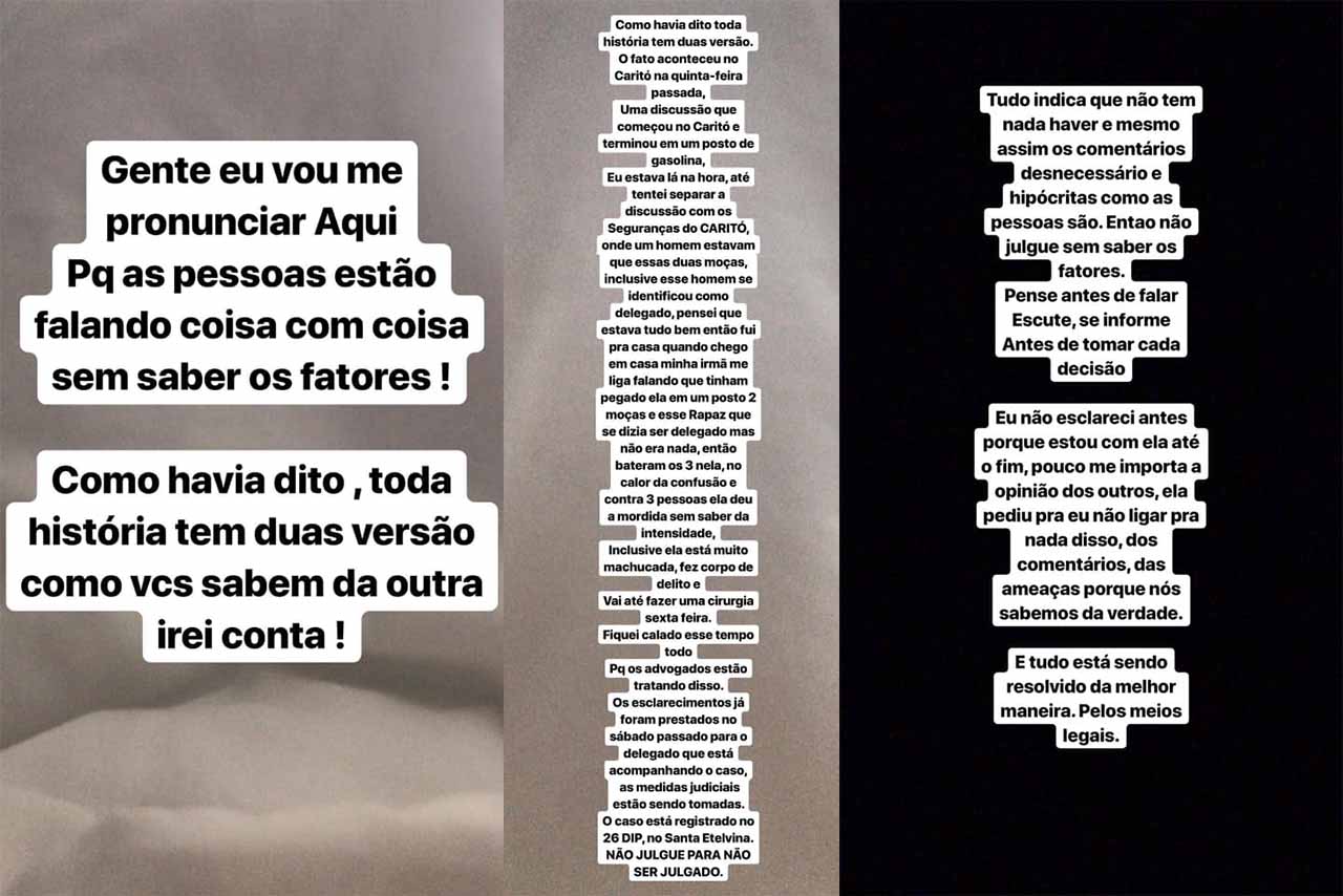 “Eu estava lá na hora, até tentei separar a discussão com os seguranças do Caritó, onde um homem estavam que essas duas moças, inclusive esse homem se identificou como delegado, pensei que estava tudo bem então fui para casa. Quando chego em casa minha irmã me liga falando que tinham pegado ela em um posto, 2 moças e esse rapaz que se dizia ser delegado, mas não era nada, então bateram os 3 nela. No calor da confusão e contra 3 pessoas ela deu uma mordida sem saber da intensidade. Inclusive ela está muito machucada, fez corpo de delito, vai até fazer uma cirurgia sexta-feira. Fiquei calado esse tempo todo porque os advogados estão tratando disso. Os esclarecimentos já foram prestados no sábado passado para o delegado que está acompanhando o caso, as medidas judiciais estão sendo tomadas. O caso está registrado no 26 DIP, no Santa Etelvina. NÃO JULGUE PARA NÃO SER JULGADO“, diz a publicação.