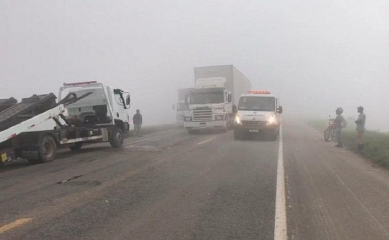 Eunápolis: Um nevoeiro espesso, no fim da madrugada desta quarta-feira (03), dificultou a visibilidade de um caminhoneiro, que precisou parar o veículo bruscamente na BR-101, a cerca de oito quilômetros de Eunápolis, e acabou causando um acidente envolvendo outros dois veículos.