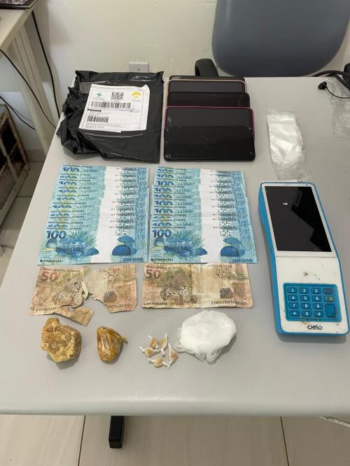 Durante a abordagem, foi encontrado um pacote contendo 20 cédulas falsas de R$ 100,00, totalizando R$ 2.000,00 em moeda falsa. A suspeita revelou que havia mais cédulas em sua residência e que os materiais pertenciam ao seu namorado. Na casa da suspeita, foi encontrada uma nota de cinquenta reais falsa, além de fragmentos de outra cédula. Também foram localizados no mesmo móvel, próximo à nota falsa, as seguintes substâncias: 2 pedras brutas de material análogo ao crack, 5 pedras fracionadas e embaladas de material análogo ao crack, 1 pacote de pó branco, supostamente cocaína, 5 aparelhos celulares e 1 máquina de cartão. A suspeita alegou que o material não lhe pertencia e informou que na residência moravam ela e sua mãe.