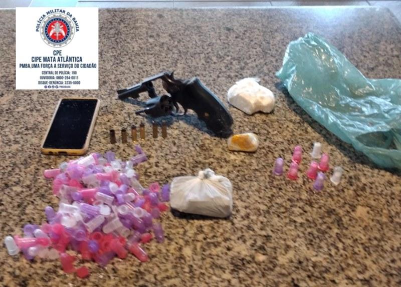 Com o autor, os policiais encontraram um revólver Cal.32 com dois cartuchos deflagrados, dois picotados e dois intactos, e uma sacola de cor esverdeada contendo entorpecentes (100g de cocaína, 30g de maconha, aproximadamente 20g de crack, oito endoffs com cocaína pronta para comercialização e 200 endoffs vazios). ‘Bochecha’, possui passagens na polícia por tráfico de drogas,porte ilegal de arma e dois homicídios, sendo considerado de alta periculosidade.