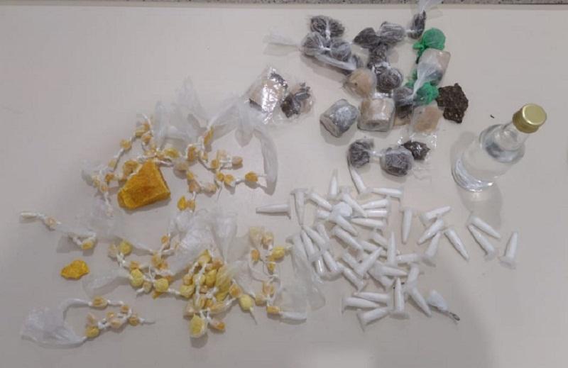 Ao chegarem no local, vários indivíduos empreenderam fuga, sendo alcançado um dos suspeitos. De imediato, foi realizada uma busca pessoal e os militares encontraram na posse do suspeito, uma bolsa tipo “pochete”, contendo diversos entorpecentes. No total, foram apreendidas 91 (noventa e uma) pedras de crack; 23 (vinte e três) buchas de maconha; 01 pedra bruta de crack; 03 (três) tabletes pequenos de maconha; 46 (quarenta e seis) pinos de cocaína; 01 aparelho celular, marca Samsung, e 01 frasco de lança perfume.