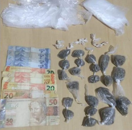Com a suspeita confirmada, foi realizada a abordagem e busca pessoal. Com José Roberto a equipe encontrou dinheiro e 22 buchas de maconha dentro da residência.