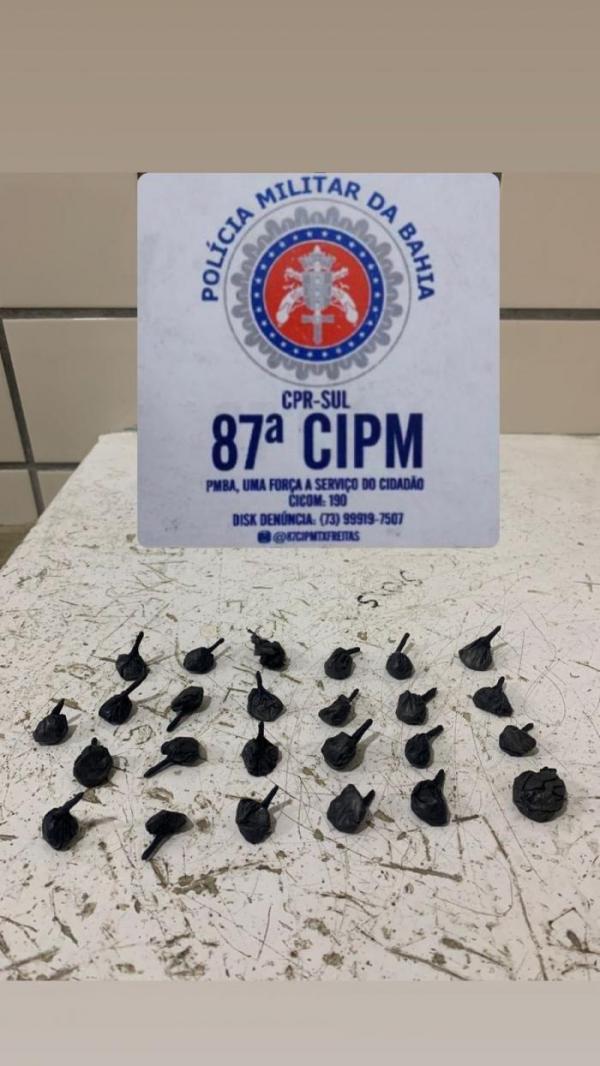 A guarnição da 87ª CIPM estava realizando patrulhamento de rotina naquela área, quando observaram um comportamento de suspeitos compatível com a prática de tráfico de drogas. Ao procederem com a abordagem, os policiais encontraram um total de 25 porções de cocaína. O peso aproximado das porções apreendidas é de 21 gramas.
