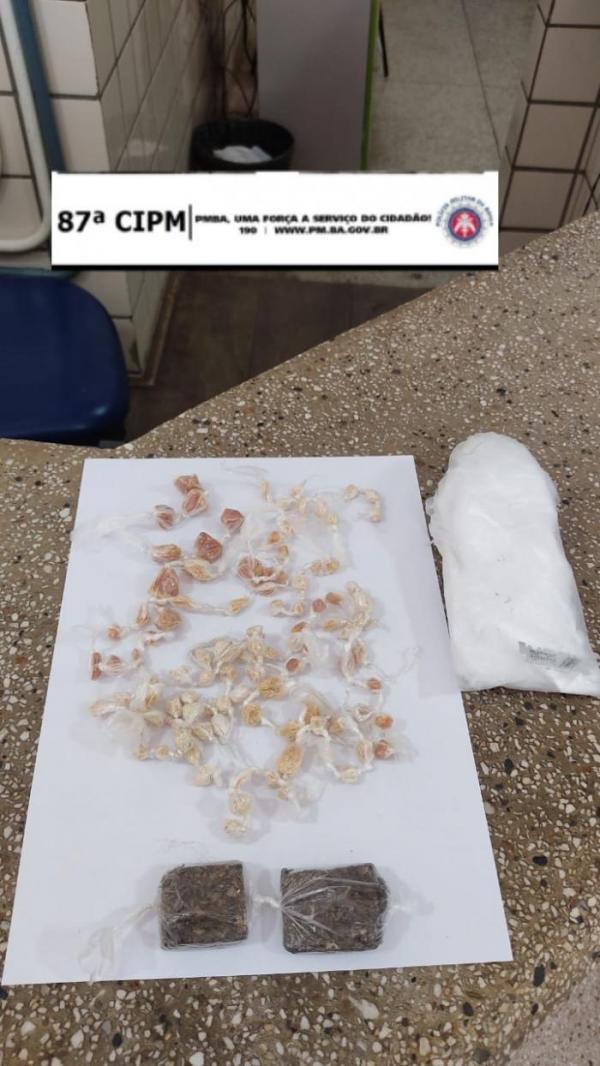 O material apreendido inclui dois papelotes de maconha, totalizando 22 gramas, 108 pedras de crack, com um peso total de 33 gramas e embalagens relacionadas ao tráfico de drogas.