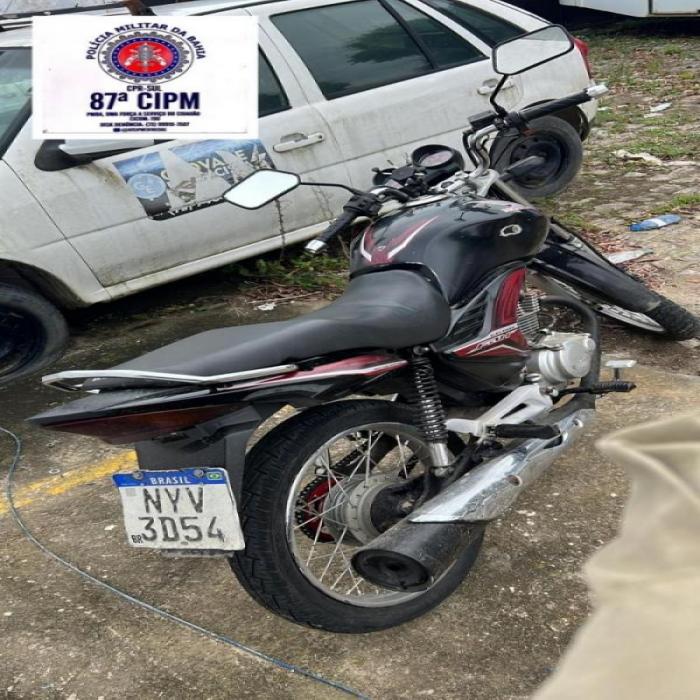 A motocicleta Honda CG 150, cor preta, placa NYV3D54 que ele conduzia, também foi apreendida e apresentada na delegacia de Teixeira de Freitas.