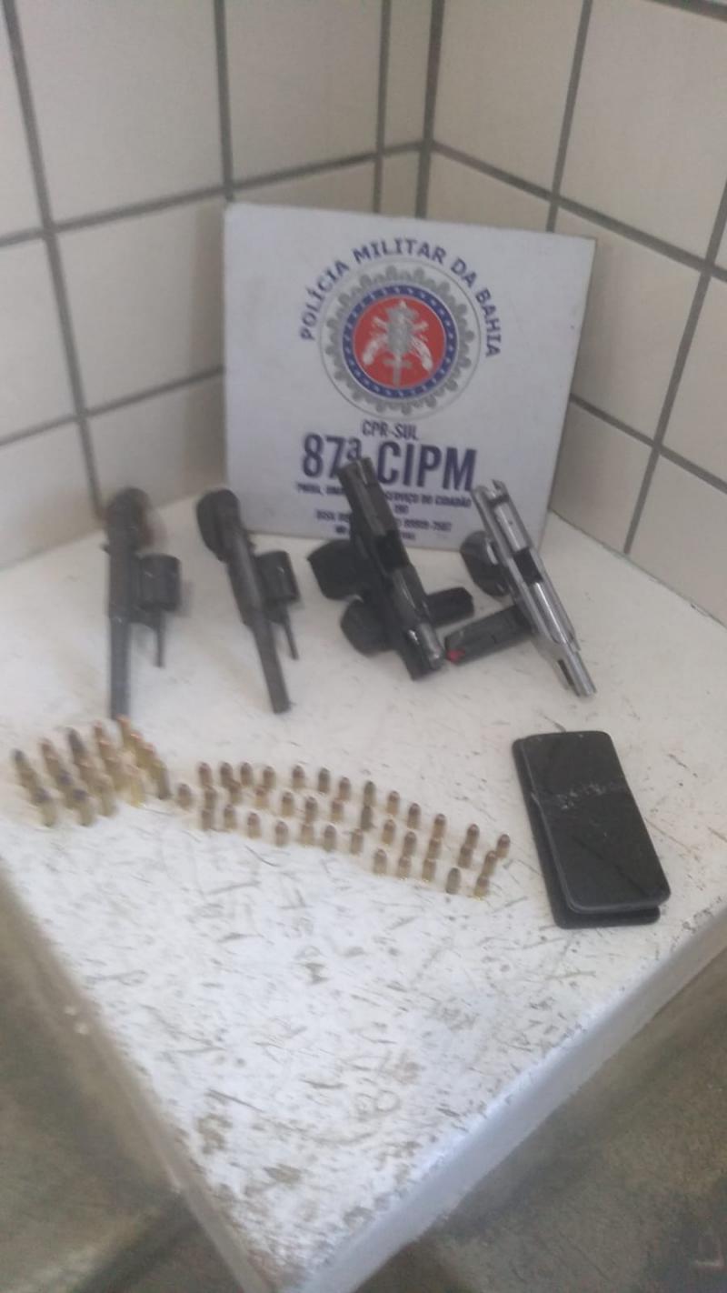 A PM apreendeu dois revólveres, calibre .38, com as numerações suprimidas e duas pistolas calibre .380. Uma delas também estava com a numeração suprimida. Além disso, foram apreendidas 19 munição de revólveres e 38 munições de pistolas.
