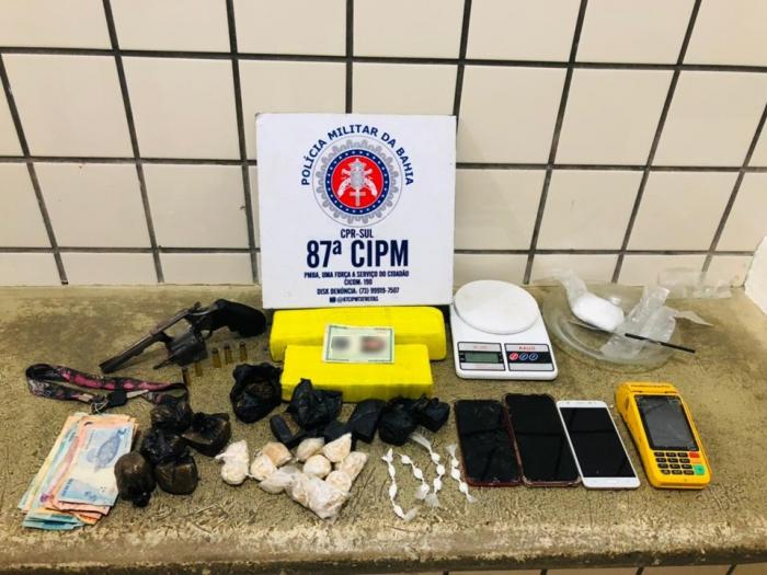 Na noite deste sábado (23) a Polícia Militar prendeu um homem de 20 anos e uma mulher de 21, suspeitos de tráfico de entorpecentes no distrito de Santo Antônio, município de Teixeira de Freitas. Foi apreendido muita droga, arma de fogo, dinheiro, material usado para organizar o comércio de droga e uma motocicleta com restrição de roubo ou furto.
