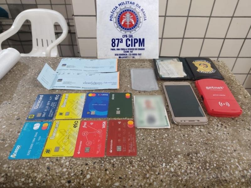 Além disso a PM apreendeu com ele oito cartões bancários, uma máquina de cartão de crédito e duas folhas de cheque de titulares diferentes.