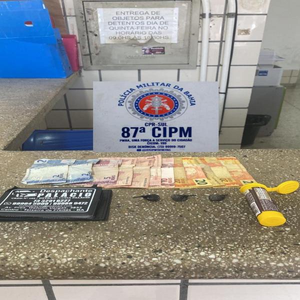 Ele estava com três papelotes de cocaína e R$ 149 à bordo da motocicleta Titan 150, cor preta e foi apresentado na Delegacia de Teixeira de Freitas.