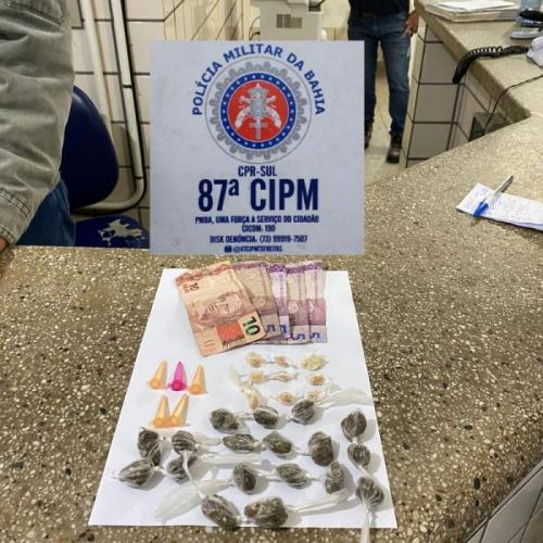 Na abordagem, policiais da 87ª Companhia Independente de Polícia Militar encontraram com o suspeito 18 papelotes de maconha, 10 pedras de crack, 5 pinos de cocaína e R$ 30.