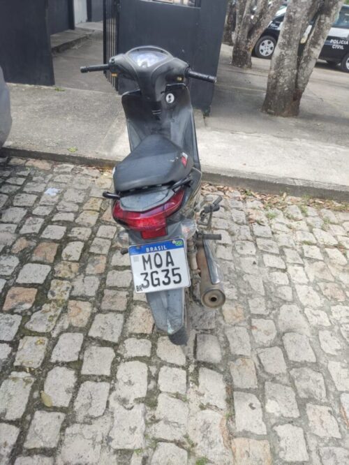 Policiais da 87ª Companhia Independente de Polícia Militar apreenderam a Honda/Biz 125 ES, de cor preta, placa MOA3G35 e o Certificado de Registro e Licenciamento de Veículo (CRLV) de uma motocicleta da mesma marca, modelo e cor, porém com a placa OKY5243, com restrição de roubo.