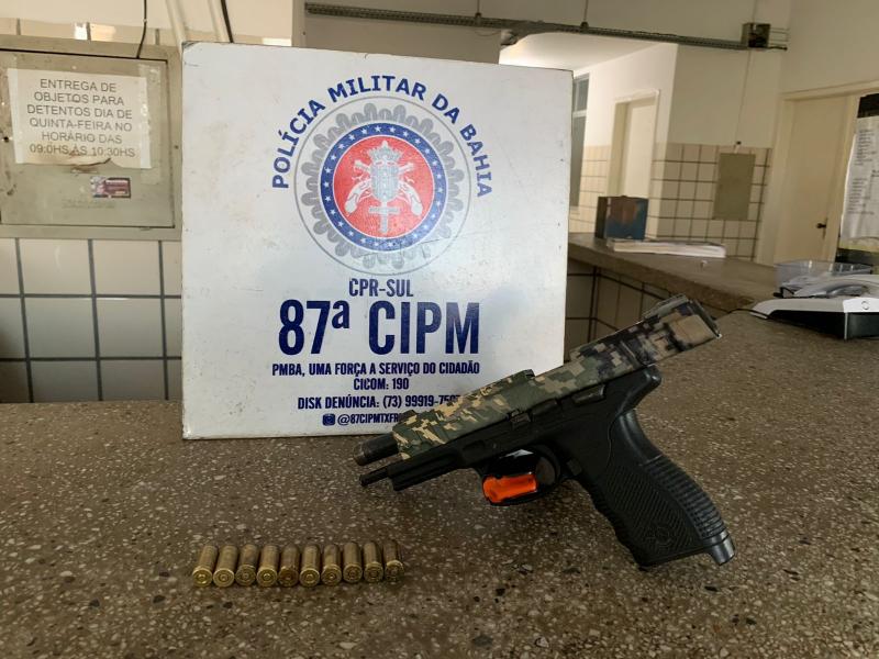 Ele foi abordado por policiais da 87ª Companhia Independente de Polícia Militar na Rua Jaborandi, no Bairro Liberdade II, com um pistola Taurus, cal .40 e 10 munições.