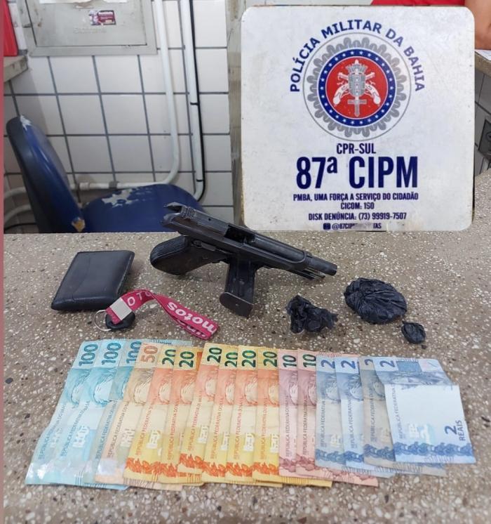 A Polícia Militar prendeu um homem na tarde desta quinta-feira (11) por porte ilegal de arma de fogo e tráfico de drogas, na cidade de Teixeira de Freitas.