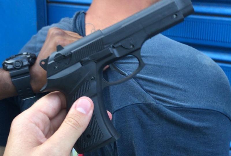 Um homem foi preso pela Polícia Militar com um simulacro de arma de fogo, tipo pistola, no final da tarde desta quarta-feira (5), no Mercado Municipal, na região central de Teixeira de Freitas.