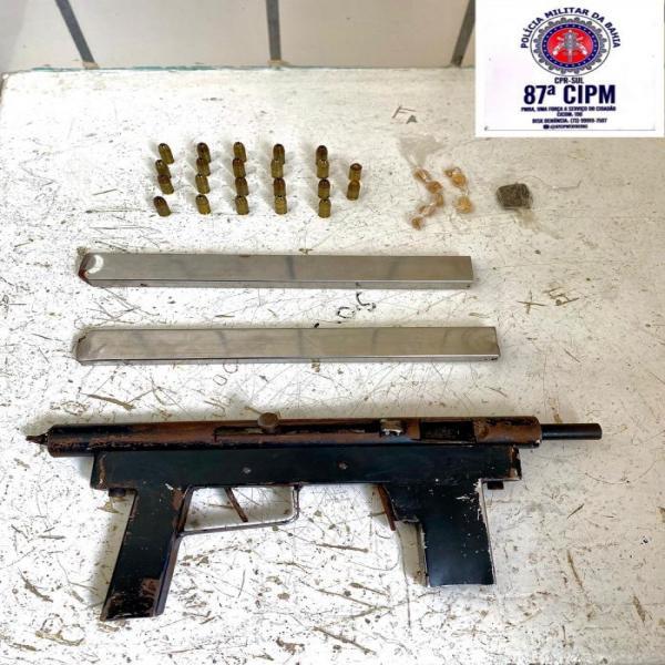A Polícia Militar prendeu em flagrante, no início da tarde desta segunda-feira (23), na cidade de Teixeira de Freitas, um homem com uma submetralhadora e dois carregadores com 22 cartuchos calibre.380.