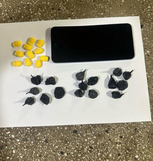 Durante a revista, foram encontrados com o suspeito uma sacola plástica e um pequeno pote contendo substâncias entorpecentes. A apreensão totalizou 16 porções de cocaína, 11 comprimidos de droga sintética e um aparelho celular.