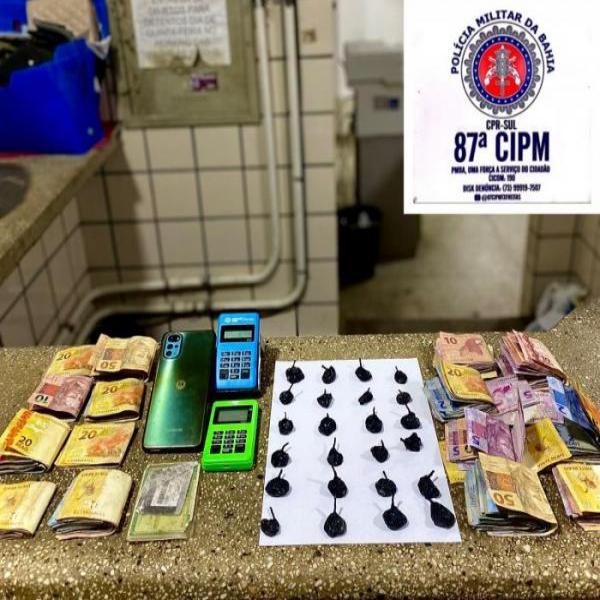 24 papelotes de cocaína, 2 máquinas de cartão de crédito e R$ 1.806. Ele foi apresentado na Delegacia de Teixeira de Freitas.