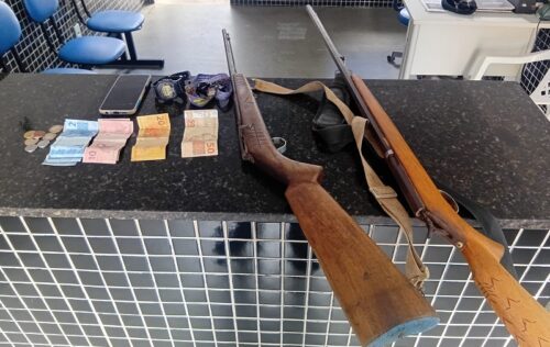Os policiais apreenderam duas espingardas de fabricação artesanal (cano de socar), um aparelho celular, um relógio de pulso digital, diversas chaves residenciais e R$ 99,55 em dinheiro. A dupla foi conduzida à Delegacia Territorial da Polícia Civil de Itamaraju. O delegado titular, Gilvan de Meireles Prates, lavrou o auto de prisão em flagrante.