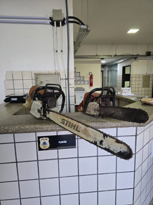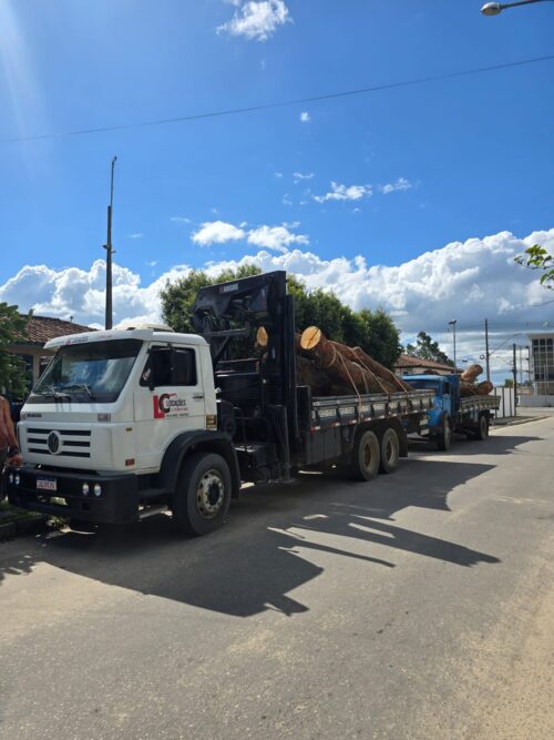 Na ação, a PM apreendeu duas motosserras, um caminhão azul da marca Mercedes-Benz, placa KHN-5G04, e um caminhão branco modelo VW/17.220, placa JQJ-9C90, utilizados no transporte da madeira.