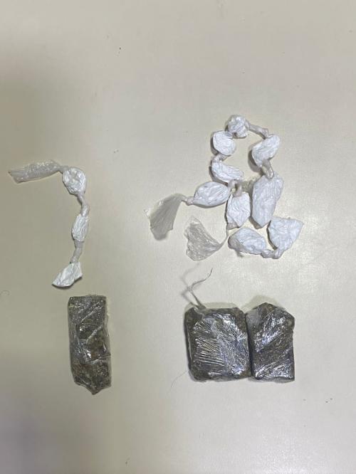 Durante a abordagem e busca pessoal, foram encontrados três tabletes de maconha, totalizando aproximadamente 28,14 gramas, e doze papelotes de cocaína, com peso estimado de 5,68 gramas.