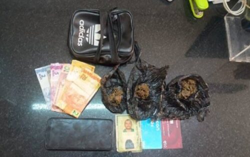Diante da fundada suspeita, foi feita a abordagem padrão e em posse do suspeito foi encontrado uma bolsa preta contento três porções de substância análoga a maconha pesando cerca de 20 gramas, 01 celular, 59 R$ em espécie.