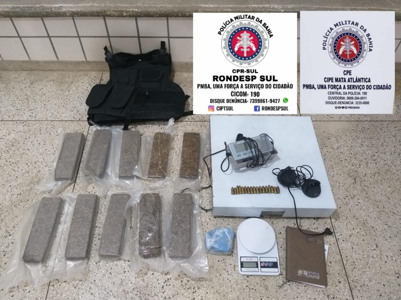 A Polícia Militar apreendeu, na noite desta sexta-feira (19), no Jardim Europa, em Teixeira de Freitas, 10 tabletes de maconha, pesando 7 quilos e 100 gramas, uma pedra de crack, pesando 444 gramas, uma balança de precisão e outra para pesagem de volumes maiores, um caderno de anotações do tráfico, uma capa de colete balístico e 17 munições calibres .380, .40 e .45.