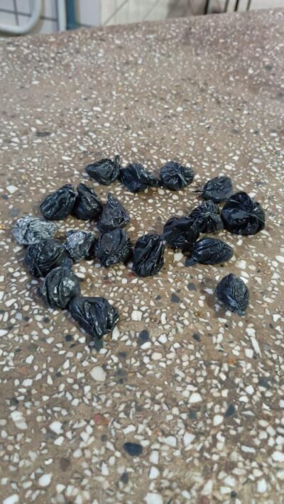 Após diligências e varredura no local, os policiais localizaram um porta-tabaco arremessado pelo suspeito. No interior do recipiente foram encontrados 19 papelotes de cocaína, totalizando aproximadamente 12 gramas da substância entorpecente.
