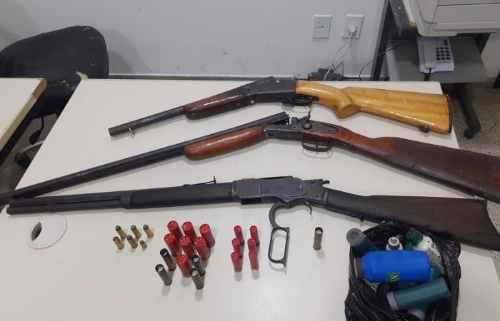 Os objetos apreendidos foram, 07 (sete) munições de calibre 12 (intactas); 13 (treze) recipientes contendo pólvora, chumbo e espoletas; 01 espingarda modelo 151; numeração 1182018; 05 (cinco) munições 556 deflagradas; 05 (cinco) munições .44 (intactas); 01 espingarda .32; 01 carabina (rifle) 44, de numeração 692911b; 02 (duas) munições .44 (deflagradas); 03 (três) munições calibre 12 (deflagradas); 11 (onze) munições .32 (intactas); 01 munição .380 (intacta).