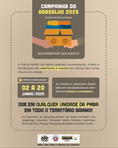Itamaraju, BA* – Com o objetivo de amenizar os efeitos do frio e das fortes chuvas que têm atingido o estado, a Polícia Militar da Bahia (PMBA) deu início à *Campanha do Agasalho 2025*. A iniciativa busca arrecadar cobertores, mantas e roupas em bom estado para doação a pessoas em situação de vulnerabilidade.