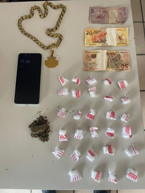 Na busca pessoal, os policiais encontraram 30 pinos de substância semelhante à cocaína, uma porção de maconha, um canivete, um cordão, um celular, R$ 75,00 em espécie e outros objetos pessoais. O suspeito confessou que vendia entorpecentes na região.