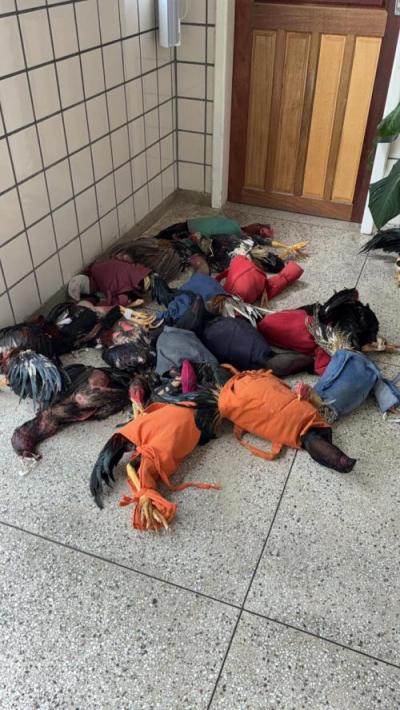No local, foram apreendidos medicamentos, seringas e aplicadores veterinários, 43 esporas artificiais, uma serra usada na confecção desses artefatos, uma balança, R$ 1.071,25 em dinheiro e seis celulares, além dos animais. Os materiais indicam que o espaço era usado para apostas e preparação dos galos para combates.