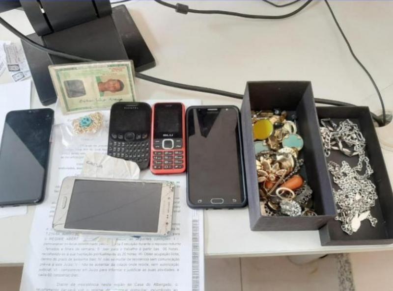 Na diligência, os materiais apreendidos foram: 20 pares de brincos dourados; 02 anéis dourados; 04 pulseiras prateadas; 04 cordões prateados; 01 cordão dourado; 05 aparelhos celulares; 01 marca Samsung de cor dourado; 02 Samsung cor preta; 01 BLU cor vermelha; 01 Alcatel preto.