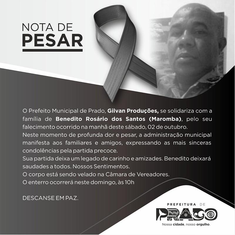 O prefeito municipal do Prado, Gilvan Produção publicou nas redes sociais uma Nota de Pesar pela morte do militar. “Sua partida deixa um legado de carinho e amizade. Benedito deixará saudades a todos. Nossos sentimentos”, escreveu o prefeito.
