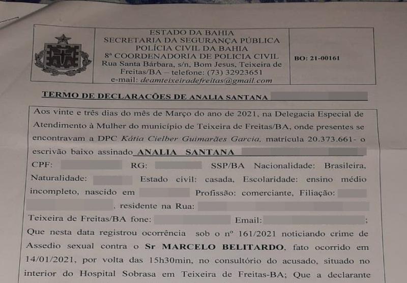 Segundo o Boletim de Ocorrência nº 21-00161, a Sra. Anália Santana dos Santos Macedo, afirma ter sido vítima de assédio sexual, cometido pelo prefeito médico, nas dependências do Hospital Sobrasa de Teixeira de Freitas.